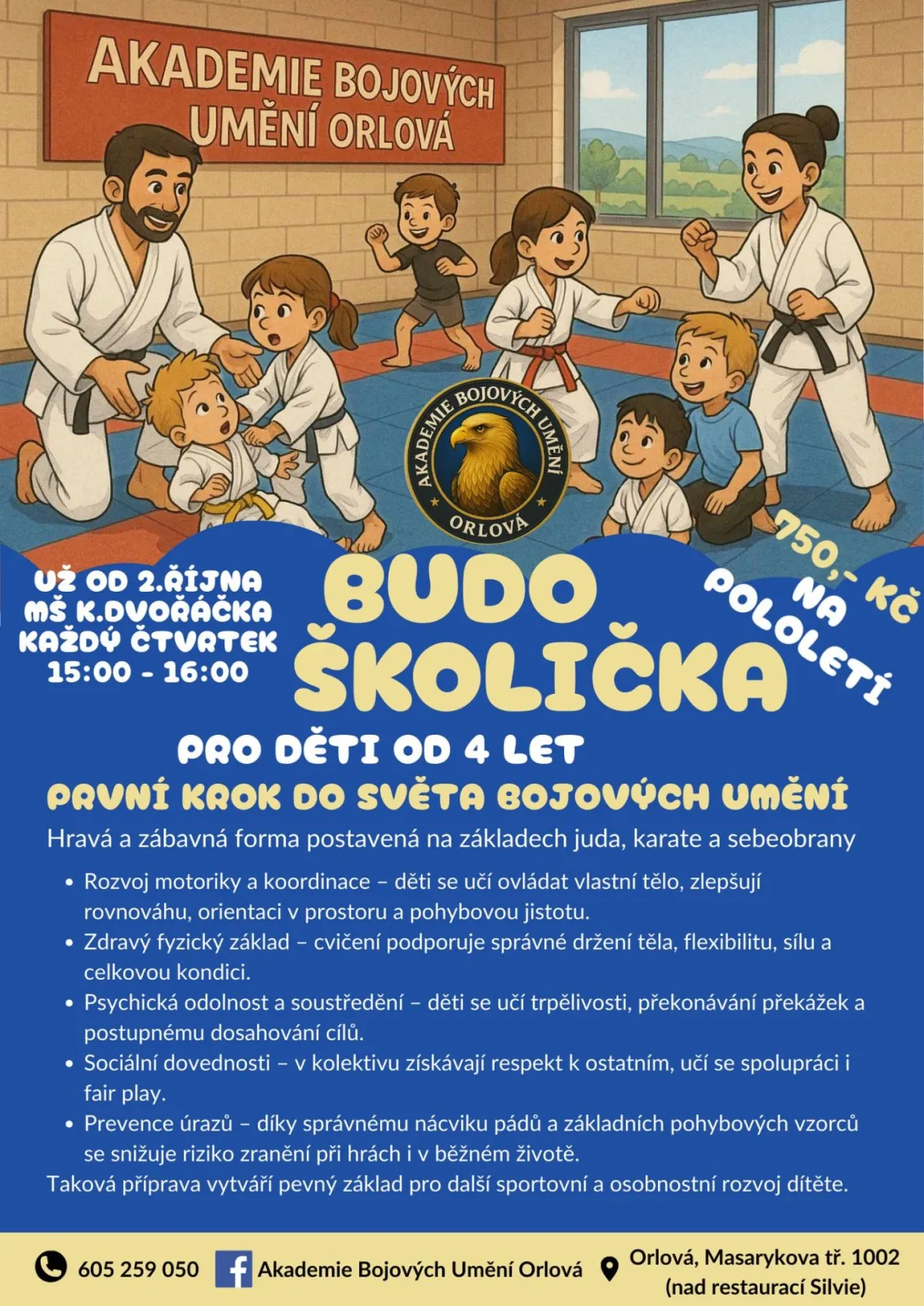 Sebeobrana pro děti — praktické a hravé lekce, které děti naučí vnímat nebezpečí, vyhnout se rizikovým situacím a bezpečně se z nich dostat. Kurz kombinuje základy prevence, jednoduché fyzické techniky přizpůsobené věku a trénink sebevědomí v přátelském a bezpečném prostředí.